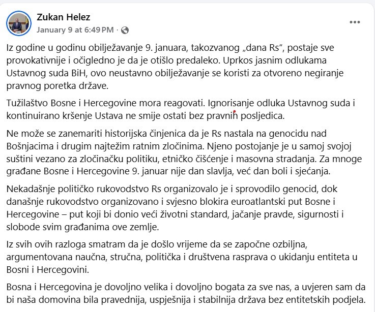 Elem, tako je neki dan ministar Helez izjavio „da je došlo vrijeme za ozbiljnu i argumentovanu raspravu na naučnom, stručnom, političkom i društvenom nivou o ukidanju entitetskog uređenja.“ Potom je dodao: „da Bosna i Hercegovina ima dovoljno kapaciteta za sve svoje građane te da bi, bez entitetskih podjela, mogla biti pravednija, uspješnija i stabilnija država.“