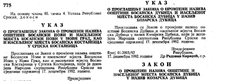 Tata Radovan bi bio ponosan na kćerkinu inicijativu jer upravo je on svojim ukazom od 17. decembra 1992. godine preimenovao Bosanski Novi u Novi Grad,  Bosansku Dubicu u Kozarsku Dubicu, Bosansku Kostajnicu u Srpsku Kostajnicu i legendarni Srbobran umjesto Donjeg Vakufa.