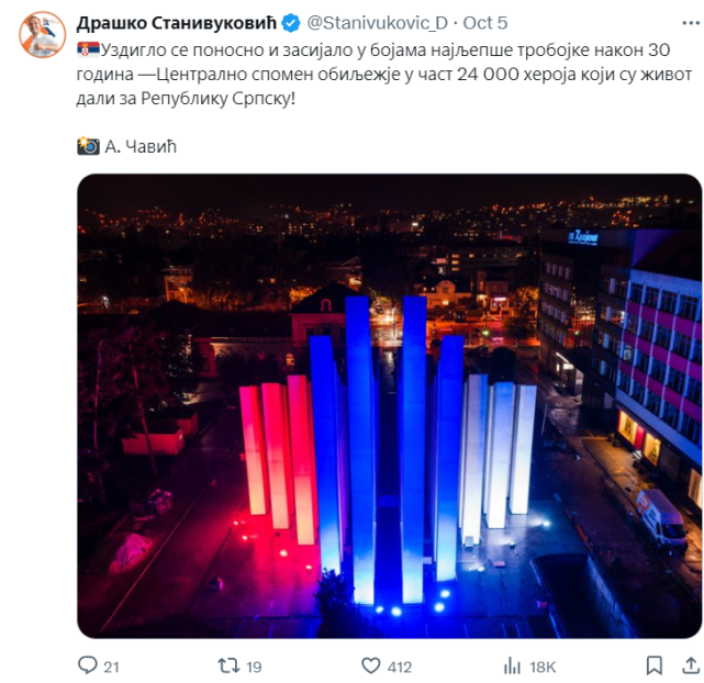 Ove godine lokalni izbori u BiH su održani  6. oktobra. Dan ranije gradonačelnik Banjaluke Draško Stanivuković je objavio svoj status na mreži X, a vjerujem i drugim mrežama, sa fotografijom Centralnog spomen obilježja poginulim borcima Vojske Republike Srpske.