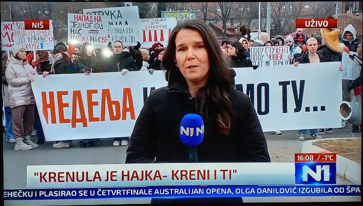 Tokom javljanja novinara N1 – Srbija sa protesta u Nišu, juče, nedjelja 19. januar 2025. godine na ekranu piše „KRENULA JE HAJKA-KRENI I TI“.