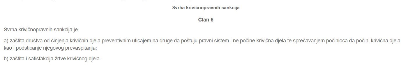 - a) zaštita društva od činjenja krivičnih djela preventivnim uticajem na druge da poštuju pravni sistem i ne počine krivična djela te sprečavanjem počinioca da počini krivična djela kao i podsticanje njegovog prevaspitanja;