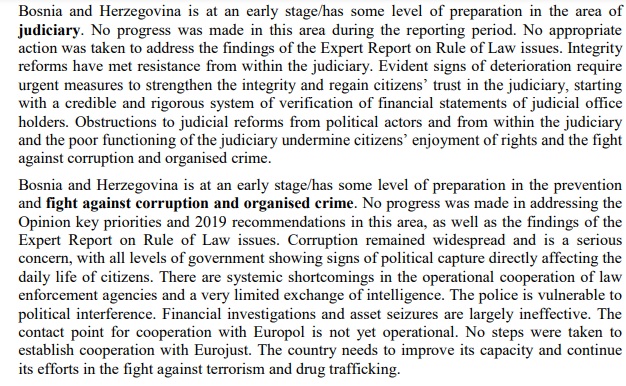 Kada ovo vidimo onda je jasno zašto je insistiranje EU na reformi pravosudnih institucija označeno kao „antisrpska“, tj „antibošnjačka“, „antihrvatska“ zavjera, a evroskepticizma sve otvorenije pothranjivan od strane „javnih“ servisa. Najnoviji izvještaja o „napretku“ (sic!)BH u EU-integracijama, na strani 5. kaže npr ovo:
