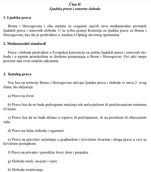- (i) Ustav BiH, Član II, stav 3: „Sva lica na teritoriji Bosne i Hercegovine uživaju ljudska prava i slobode … što uključuje: g) Slobodu misli, savjesti i vjere. h) Slobodu izražavanja”.
