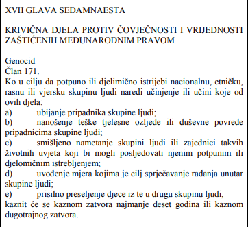 Zločin genocida je krivičlno djelo precizno definisano članom 171. (Glava 17.) Krivičnog zakona Bosne i Hercegovine i oko toga ne bi trebalo da bude velike polemike.
