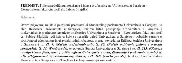 Predstavnici Udruženja Studentski parlament Univerziteta u Sarajevu, Imran Pašalić, Faruk Dević i Edin Maslo, od Etičkog odbora Univerziteta u Sarajevu traže da profesorica Sabinu Silajdžić ide na psihičku procjenu jer sumnjaju u njene „sposobnosti adekvatnog izvršavanja radnih obaveza“.