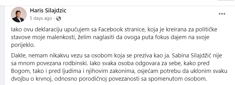 Harisa Silajdžića da je u rodbinskoj vezi sa profesoricom Silajdžić,