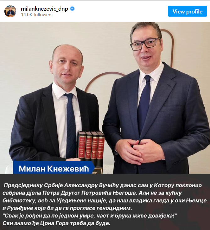 Elem, neki dan, tačnije 16. maja, održan je Samit lidera Zapadnog Balkana i Evropske unije u Kotoru na kojem su lideri regiona, predstavnici Evropske unije i Sjedinjenih Američkih Država razmatrali Plan rasta za Zapadni Balkan. Na samitu se pojavio i lider nad liderima predsjednik Srbije Aleksandar Vučić, koji se na margini samita sastao sa predsednikom Demokratske narodne partije u Crnoj Gori, Milanom Kneževićem koji mu je tom prilikom poklonio sabrana dela Petra Drugog Petrovića Njegoša, a potom na Instagramu napisao “Predsedniku Srbije Aleksandru Vučiću danas sam u Kotoru poklonio sabrana dela Petra Drugog Petrovića Njegoša. Ali ne za kućnu biblioteku, već za Ujedinjene nacije, da naš vladika gleda u oči Nemce i Ruanđane koji bi da ga proglase genocidnim. Svak je rođen da po jednom umre, čast i bruka žive dovijeka! Svi znamo gde Crna Gora treba da bude”