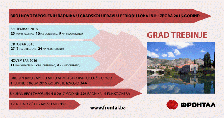 U izbornoj 2016. godini znatno je povećan ukupan broj novozaposlenih u gradskoj upravi, koji je prevazišao ukupan broj predviđen Zakonom o lokalnoj upravi i samoupravi. Prema tom zakonu, u Gradskoj upravi grada Trebinje trebalo bi biti zaposleno 86 radnika.