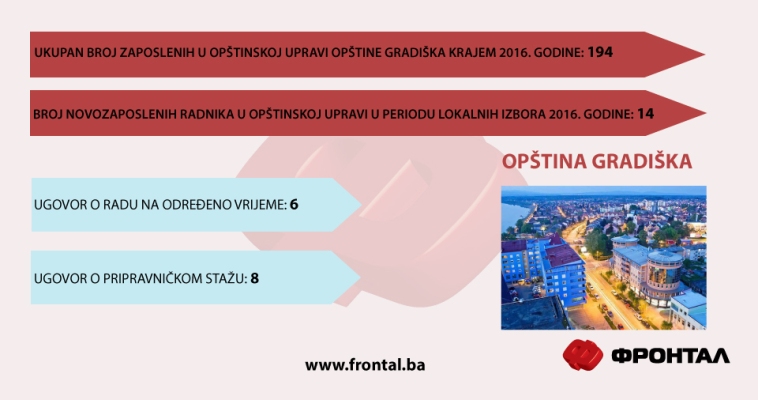 Samo u izbornoj 2016. godini u opštinskoj upravi u Gradišci zaposleno je 14 novih radnika, i to po Ugovoru na određeno vrijeme 6 i po Ugovoru o pripravničkom stažu 8, dok je u 2015. godini koja nije bila izborna zaposleno svega dvoje novih radnika.