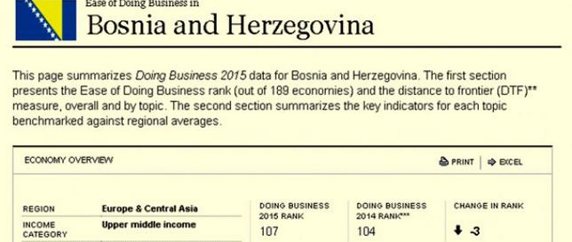 U juče objavljenom opsežnom izvještaju Svjetske banke „Poslovanje u 2015. godini", naime, BiH rangirana je na 107. mjestu, što je najgore od svih evropskih država.
