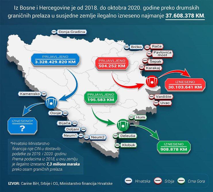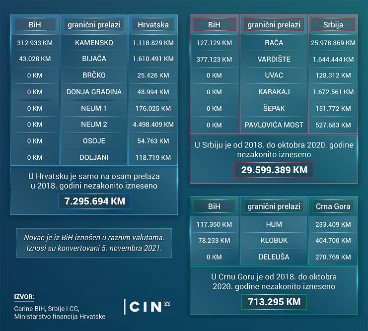 Prema podacima UIOBiH, od 2018. do oktobra 2020. godine je u Srbiju i Crnu Goru izneseno skoro 700 hiljada maraka keša, dok je njima prijavljen 44 puta veći unos iz naše zemlje: 30 miliona KM u Srbiju i 909 hiljada KM u Crnu Goru.