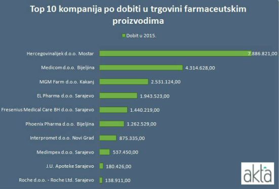 Podaci pokazuju da je šest kompanija ( Hercegovinalijek d.o.o. Mostar, Medicom d.o.o. Bijeljina, MGM Farm d.o.o.Kakanj, EL Pharma d.o.o. Sarajevo, Fresenius Medical Care BH d.o.o. Sarajevo, Phoenix Pharma d.o.o. Bijeljina) imalo profit od preko milion KM, a ukupna iznos ukupne dobiti za navedene kompanije iznosi preko 19 miliona KM.