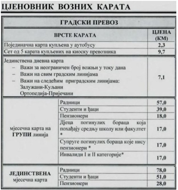 Cijena pojedinačne karte za jednu zonu u Kantonu Sarajevo iznosi 1,40 KM, umjesto dosadašnjih 1,60 KM i primjenjivaće se do 31. decembra 2022. godine, dok cijena jedinične karte za komercijalnu liniju ostaje ista i iznosi 2 KM.