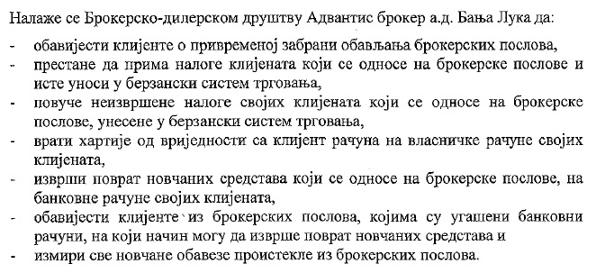 S obzirom na zabranu, Banjalučka berza je „Advantis broker“ privremeno isključila iz obavljanja brokerskih poslova na Berzi.