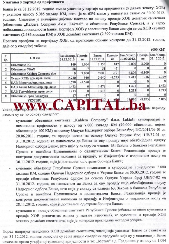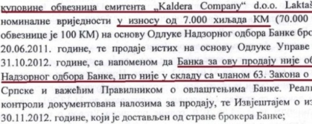 Balkan Investment Banka je 31. oktobra 2012. godine prodala IRB-u 70.000 obveznica „Kaldera Company“ pojedinačne cijene 100 KM, bez odluke Nadzornog odbora Banke, čime je prekršen Zakon o bankama Republike Srpske, navodi se u tajnom „Izvještaju o obimnoj kontroli“ koju je početkom 2013. godine uradila Agencije za bankarstvo.