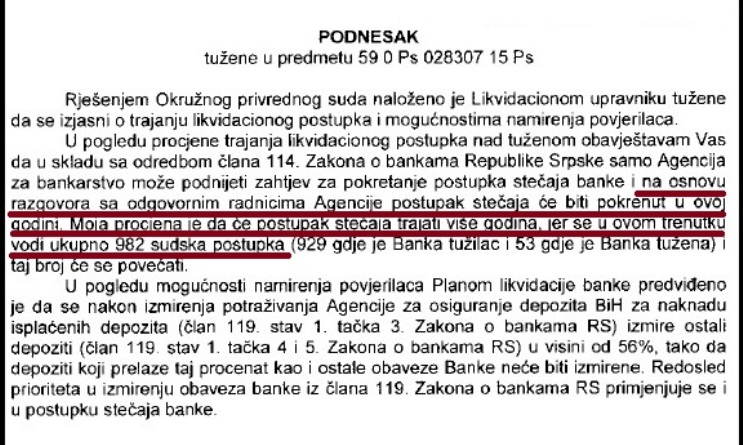 „Na osnovu razgovora sa odgovornim radnicima banke postupak stečaja će biti pokrenut u ovoj godini. Moja procjena je da će stečaj trajati više godina, jer se u ovom trenutku vode ukupno 982 postupka i to 929 u kojima je banka tužilac i 53 u kojima je banka tužena“, naveo je Maksimović i dodao da će se broj sudskih postupaka povećavati.