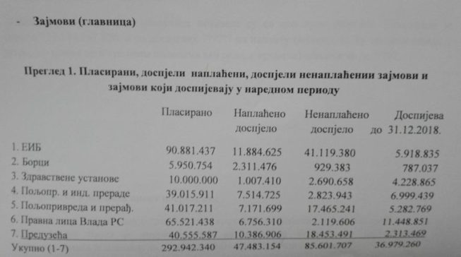 Od ukupno plasiranih 292,9 miliona KM, do 19. septembra prošle godine, na plaćanje je dospjela glavnica u iznosu od 133 miliona KM.