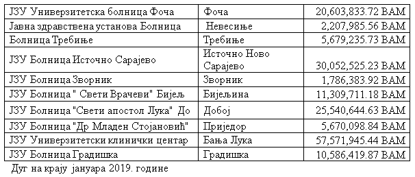 Ubjedljivo najveći poreski dužnik je Univerzitetski klinički centar RS koji je na kraju januara ove godine imao 57,7 miliona KM duga, a slijede ga Bolnica Istočno Sarajevo sa 30 miliona, dobojska bolnica „Sveti apostol Luka“ sa 25,5 miliona te Univerzitetska bolnica Foča sa 20,6 miliona KM.