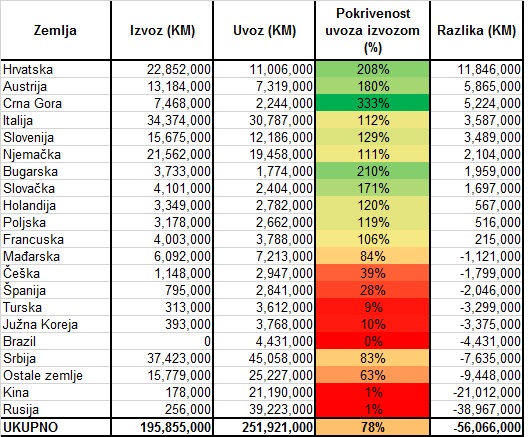 Izvezeno je robe u  vrijednosi od 195,855,000 KM dok je uvoz bio 251,921,000 KM.