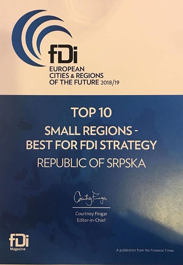 ​​​Ovom nagradom Srpska je svrstana u 10 malih regija budućnosti za 2018/2019. godinu za strategiju privlačenja stranih ulaganja. Dodjelu nagrada organizovao je FDI magazin, koji izdaje Fajnenšl tajms.