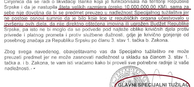 „Činjenica da se radi o likvidaciji Banke koja je funkcionisala na teritoriji Republike Srpske i da je nastupila šteta velikih razmjera (preko 10 miliona KM), sama za sebe nije dovoljna da bi se predmet preuzeo u nadležnost Specijalnog tužilaštva jer ne postoje osnovi sumnje da je bilo koje lice iz republičkih organa učestvovalo u izvršenju ovih djela, da nije direktno oštećena imovina ili ugrožen Budžet Republike Srpske, pa isto ne bi moglo da se podvede pod najteže oblike krivičnih djela protiv privrede i platnog prometa i protiv službene dužnosti, gdje je krivično gonjenje od posebnog značaja za RS“, napisao je Glavni specijalni tužilac Miodrag Bajić u odgovoru Okružnom tužilaštvu Bijeljina vraćajući im predmet „Bobar banka“, koji je u posjedu portala CAPITAL.