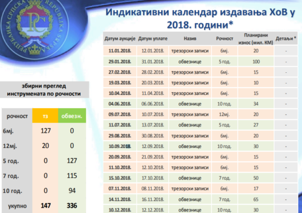 Planom Ministarstva finansija RS u ovoj godini predviđeno je zaduženje RS putem hartija od vrijednosti u ukupnom iznosu od 483 miliona KM, ali u prvom kvartalu nisu održane dvije emisije trezorskih zapisa u vrijednosti od 25 miliona KM, tako da se od planiranih 145 miliona RS u ovom periodu zadužila 120 miliona KM.