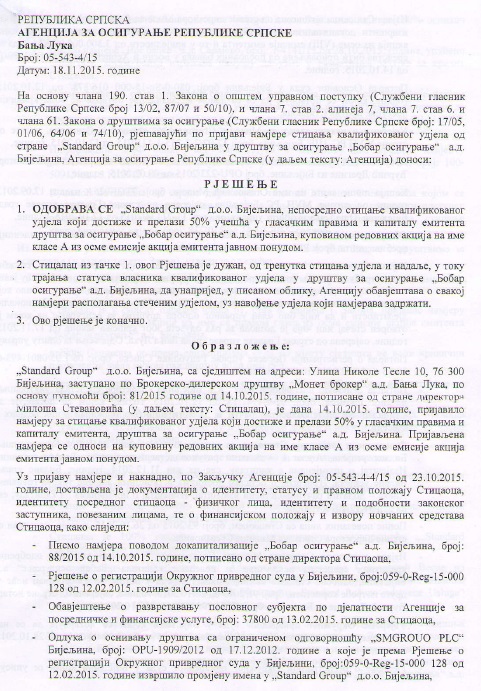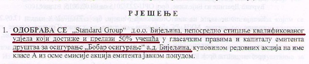 Rješenjem Agencije od 18. novembra odobrava se „Standard Group“ „neposredno sticanje kvalifikovanog udjela koji dostiže i prelazi 50 odsto učešća u glasačkim pravima i kapitalu „Bobar osiguranje“ kupovinom redovnih akcija javnom ponudom“.