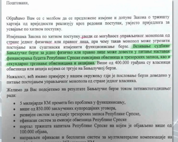 “Vezivanje sudbine Banjalučke berze za jedno fizičko ili pravno lice može dovesti u pitanje nastavak finansiranja budžeta Republike Srpske emisijama obveznica i trezorskih zapisa, kao i sekundarno trgovanje obveznicama i akcijama”, navedeno je u pismu.