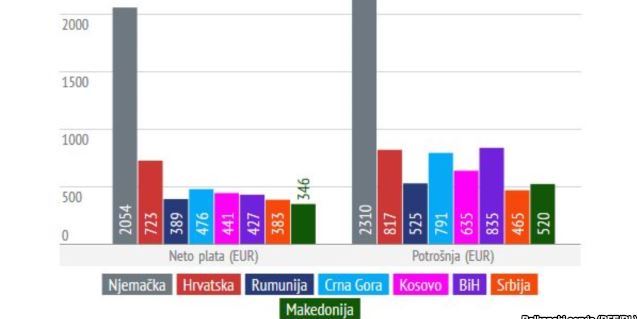 Prosječna neto plata na Kosovu u javnom sektoru, u kome je 82.000 zaposlenih, je oko 440 evra mjesečno. U privatnom dijelu privrede, u kome radi oko 222.000 lica, primanja su znatno niža. Zvaničnih podataka nema, ali iz Nezavisnog sindikata privatnog sektora na Kosovu kažu da je plata nešto iznad 200 evra. S druge strane, potrošačka korpa iznosi 116 evra mjesečno po osobi, a potrošnja domaćinstva je 635 evra – navodi Amra Zejneli u tekstu "Cene evropske, plate i penzije balkanske".