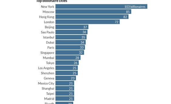 I, gdje oni žive?: Skoro 35% najbogatijih ljudi svijeta su koncentrisani u 20 gradova, od kojih su, opet, samo dva grada u SAD – New York, sa 103 milijardera na prvom, te Los Angeles sa 25 njih na 13. mjestu. Zanimljivo, Moskva se nalazi na drugom mjestu sa 83 svojih stanovnika – milijardera. Uprkos tome, u SAD se nalazi skoro 25% najbogatijih ljudi na svijetu i po tome Amerika prednjači u odnosu na ostale zemlje.