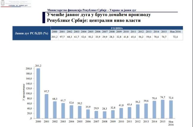 Iz pres službe Ministarstva finansija Srbije ističu da stanje duga opšte države na dan 30. novembar 2016. iznosi 25.067.195.436 evra, od čega javni dug centralnog nivoa vlasti Republike Srbije iznosi 24.708.277.420 evra i negarantovani dug jedinica lokalne vlasti 358.918.005 evra.