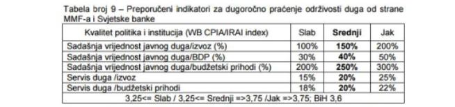 Naime, kako se kaže u Izvještaju, MMF i Svjetska banka, u svojoj zajedničkoj inicijativi, najčešće preporučuju okvir koji se sastoji od pet indikatora za dugoročno praćenje održivosti duga koji su dati u tabeli ispod, prvenstveno za zemlje sa niskim prihodima koje imaju najveći rizik za pojavljivanje problema u otplati duga, ali se njihova primjenjivost može proširiti i na zemlje sa srednjim nivoom prihoda u koje je svrstana i BiH i RS prema ocjeni Svjetske banke.