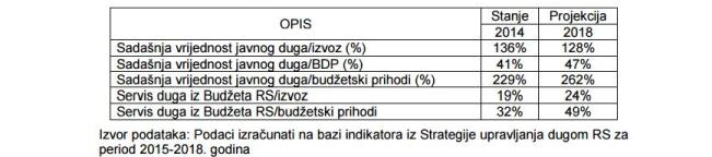 U datoj tabeli je vidljivo da će RS, na bazi projekcija Ministarstva finansija RS, u 2018. godini imati prekoračenje 4 od 5 datih indikatora, od čega jedan značajno, što ukazuje na mogući visok rizik održivosti duga.