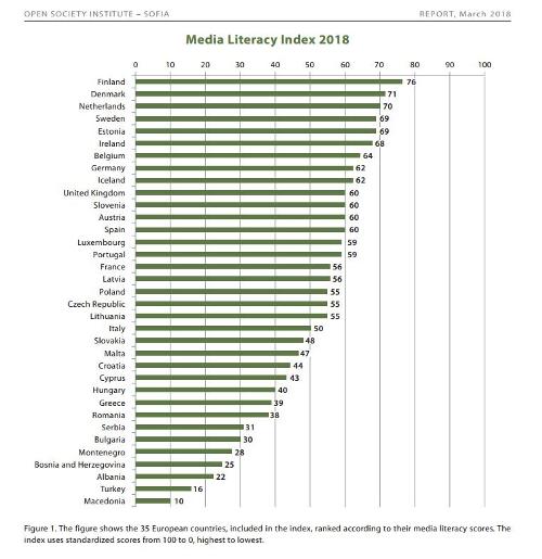 U samom evropskom vrhu su Finska, Danska, Holandija, Švedska i Estonija, dok se BiH nalazi u istoj grupi sa Srbijom, Crnom Gorom i Bugarskom. To je pokazatelj da su zemlje sjeverozapadne Evrope medijski pismenije u odnosu na zemlje jugoistočne Evrope u kojima je stepen povjerenja u medija veoma nizak.