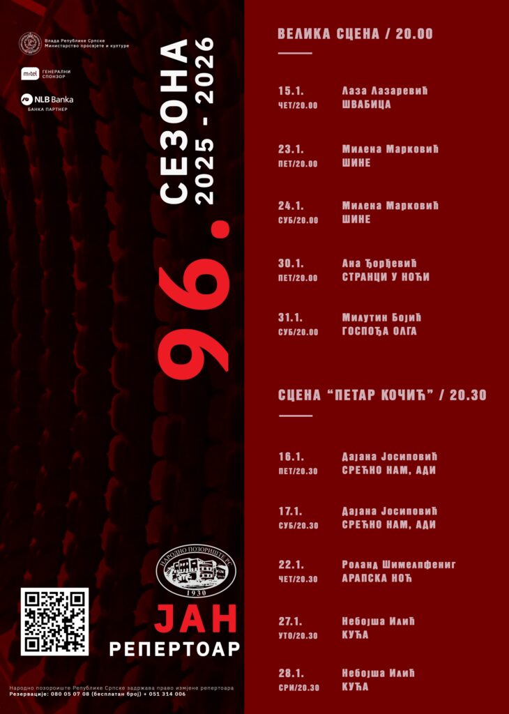 Нови репертоар Народног позоришта Републике Српске за јануар доноси разноврстан избор представа које не треба пропустити – погледајте шта вас очекује на сцени.