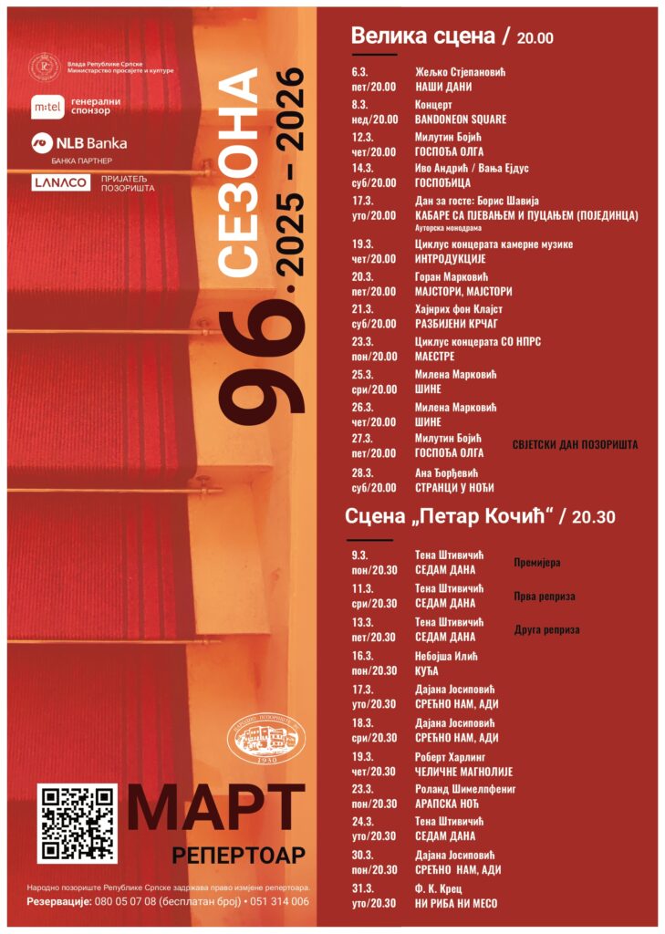 Нови репертоар Народног позоришта Републике Српске за март доноси разноврстан избор представа које не треба пропустити – погледајте шта вас очекује на сцени.