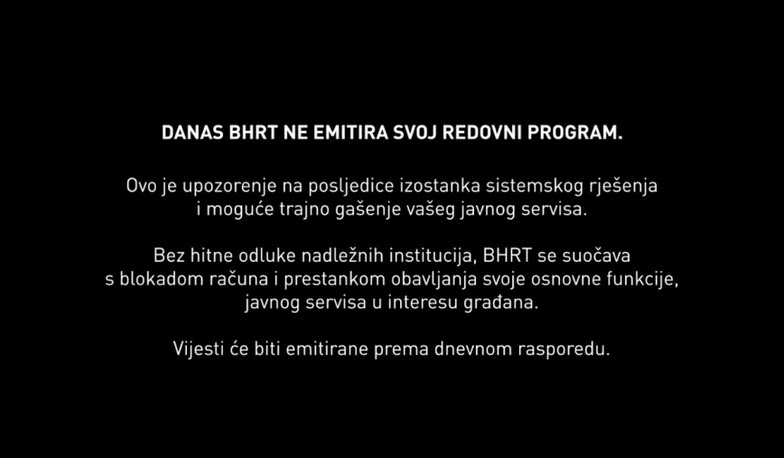 “Poštovani građani i pretplatnici, zbog izuzetno teške i dugotrajne krize u kojoj se nalazi BHRT, primorani smo da vam se obratimo na ovaj način. Okolnosti u kojima djelujemo već nekoliko godina su nepodnošlјive. Institucije Bosne i Hercegovine i entiteta, kao i Ured visokog predstavnika pokazali su izuzetnu nezainteresiranost za problem finansiranja javnog servisa BiH. Signal koji trenutno gledate, nažalost nije simbolika, već realnost. U danima koji su pred nama moglo bi doći do trajnog prekida emitiranja programa”, stoji u objavi na portalu BHRT-a.