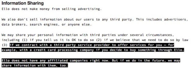 Mada, brzi pogled na politiku privatnosti ove društvene mreže pokazuje da nije sve tako jednostavno kao što se pokušava predstaviti. U njihovoj politici privatnosti piše da oni za sada ne posluju sa trećim licima koja bi mogla zahtijevati lične podatke korisnika, ali da ukoliko se pojave takvi i "Ello" odluči da ih angažuje, onda može doći do dijeljenja informacija sa njima. Prosto rečeno, oni neće prodavati naše podatke – osim ako se ne pojavi neko kome bude moguće prodati te podatke.