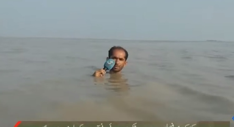 On je izvještavao iz Pundžaba, gdje se izlila rijeka Sind, a iako mu je iz vode virila samo glava i ruka kojom je držao mikrofon, on je smireno govorio o katastrofalnoj poplavi i posljedicama koje će ona izazvati, prenosi RT.