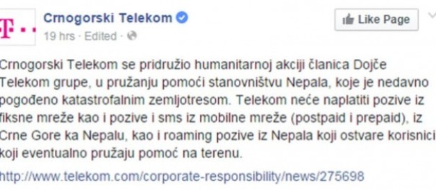 Toj akciji priključio se i Crnogorski Telekom. Ovaj mobilni operater omogućio je svim svojim korisnicima besplatne pozive iz fiksne mreže, kao i besplatne pozive i SMS poruke iz mobilne mreže ka Nepalu. Takođe su besplatni i roming pozivi iz Nepala koji naprave korisnici koji pružaju pomoć na terenu.