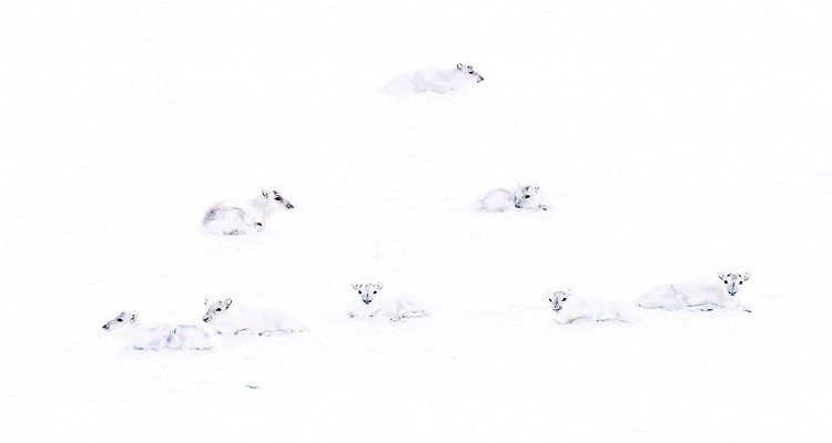 Fotografija Frensisa de Adresa na kojoj je grupa bijelih arktičkih jelena u snjegu: