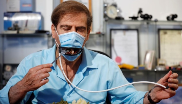 Stiskom ručice, poput ručne kočnice na biciklima, otvara se dio u prednjem dijelu maske kako bi se hrana mogla unijeti, piše Rojters.