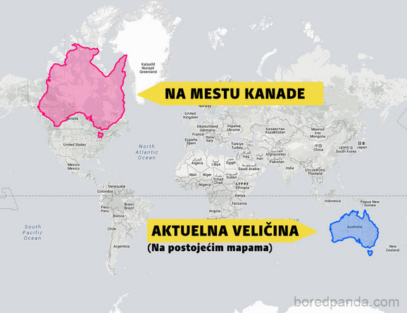 Aktuelna veličina predstavlja položaj na karti i naš doživljaj veličine Australije, ali kada se smjesti unutar Kanade zapravo se vidi koliki je stvarni odnos dvije teritorije