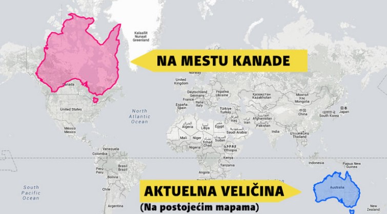 Aktuelna veličina predstavlja položaj na karti i naš doživljaj veličine Australije, ali kada se smjesti unutar Kanade zapravo se vidi koliki je stvarni odnos dvije teritorije