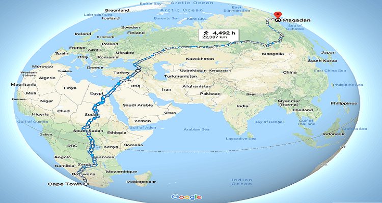 Ova mapa prikazuje jednu od najdužih mogućih šetnji na svijetu, od mjesta Kejptaun u Južnoj Africi, do Magadana u Rusiji.