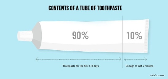 1) Pasta za zube – U prvih 5 do 8 dana potrošimo 90% paste za zube, a onih zadnjih 10% razvučemo na 4 mjeseca!