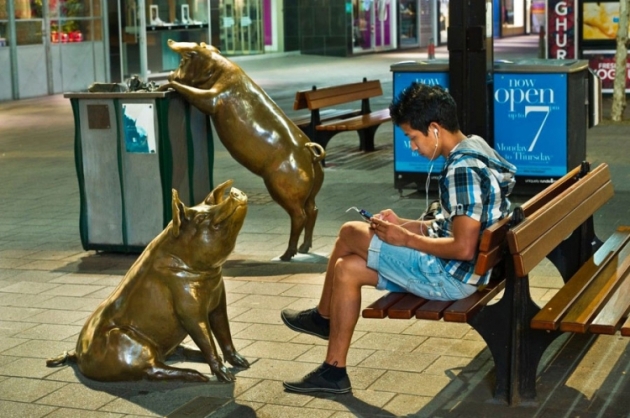 U gradu Adelaide, na jugu Australije, skulptura koja je djelo umjetnika Margarit Derikort (Marguerite Derricourt) sastoji se od četiri svinje koje zajedno sa ljudima djele park. I tako, dok Oliver kopa po đubretu, Horejšio se umiljava svojim sugrađanima.