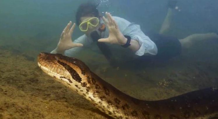 On je snimljen kako roni kraj jedne od džinovskih anakondi.