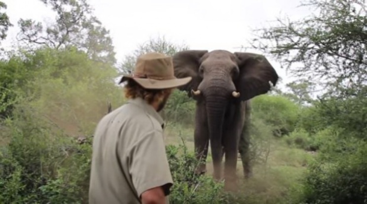 Na snimku koji je nastao u jednom parku u Južnoafričkoj Republici može se vidjeti kako turistički vodič pokazuje izuzetnu hrabrost kada je agresivni slon počeo da trči prema njemu.