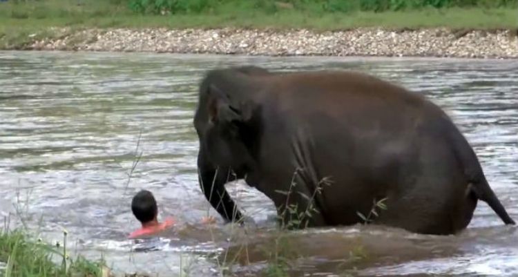 Kako je izgledalo da čovjek u jednom trenutku počinje da se davi (iako to nije bio slučaj jer je taj dio rijeke bio poprilično plitak), jedan od slonova sa obale potrčao je u vodu kako bi ga spasio.